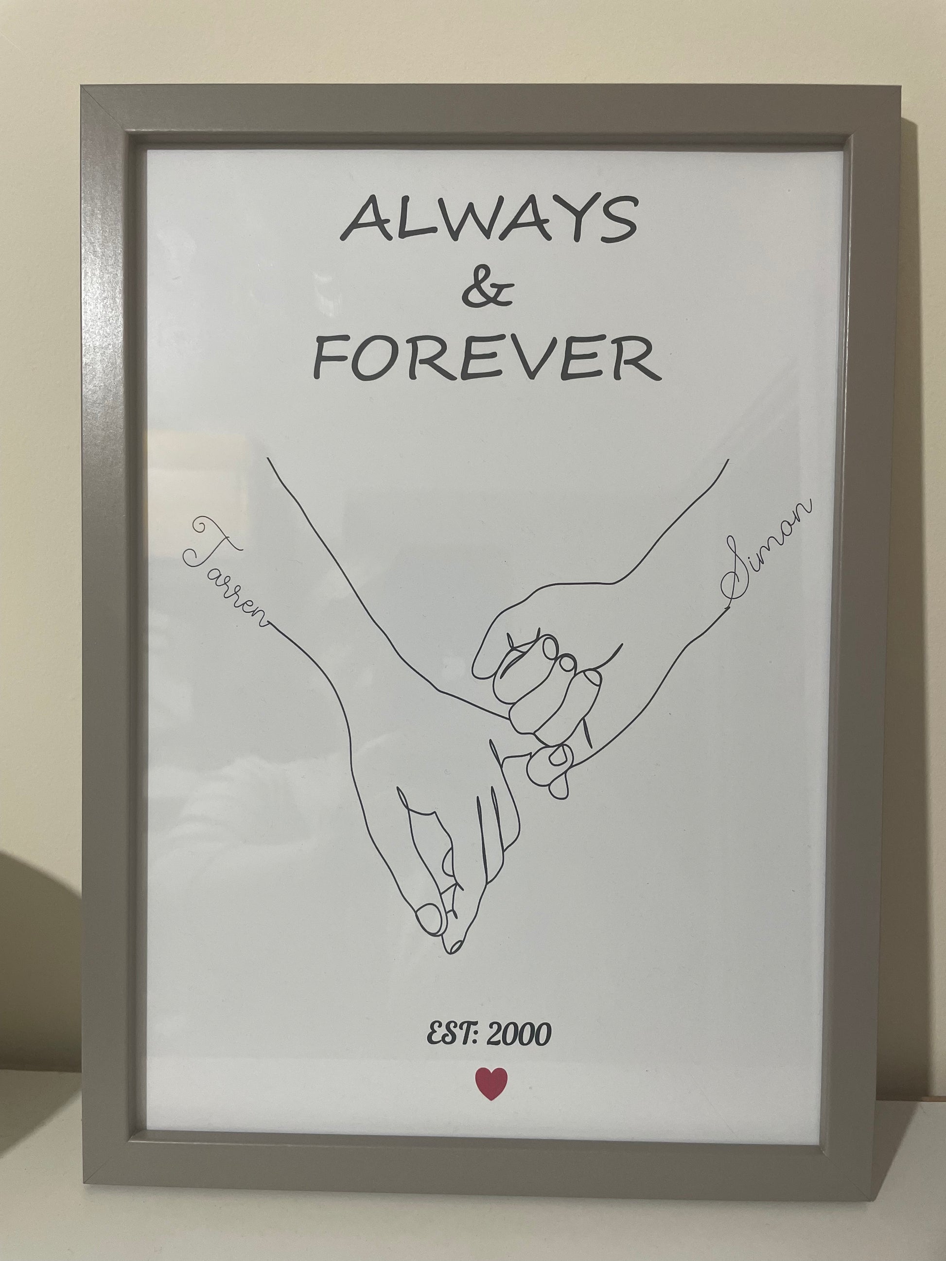 Enhance your home decor with this elegant and unique pen drawn handprint design. Perfect for welcoming guests or as a romantic gift for your significant other, this beautiful piece features personalized names and the year of your meeting. Simply stunning and perfect for any occasion.