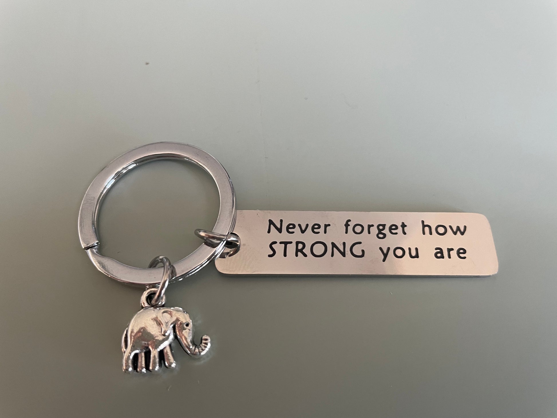 Description: A sweet and meaningful token of strength and support. This keyring features a small elephant charm alongside a rectangular tag engraved with “Never forget how STRONG you are.” Ideal for anyone going through a tough time, or as a motivational gift to lift spirits.