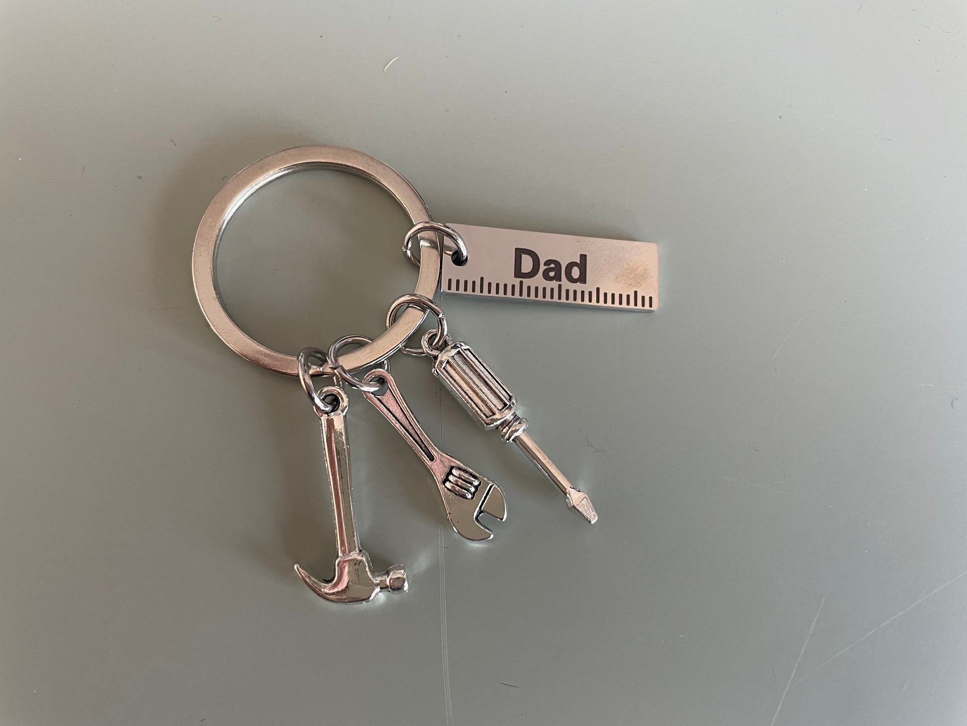 Description: The perfect keyring for the handyman in your life! This multi-charm design includes mini hammer, wrench, screwdriver, and a tag reading "Dad", all hanging from a sturdy keyring. A fantastic gift for Father's Day, birthdays, or just to say “Thanks, Dad.”